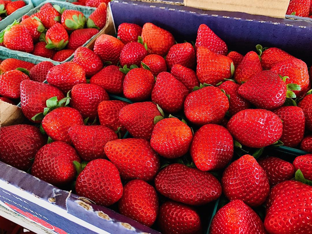 Did you know that the redder strawberries do not necessarily mean sweeter strawberries? We suggest you be on the look-out for shiny berries. And the green top, which is called a calyx, needs to look fresh.