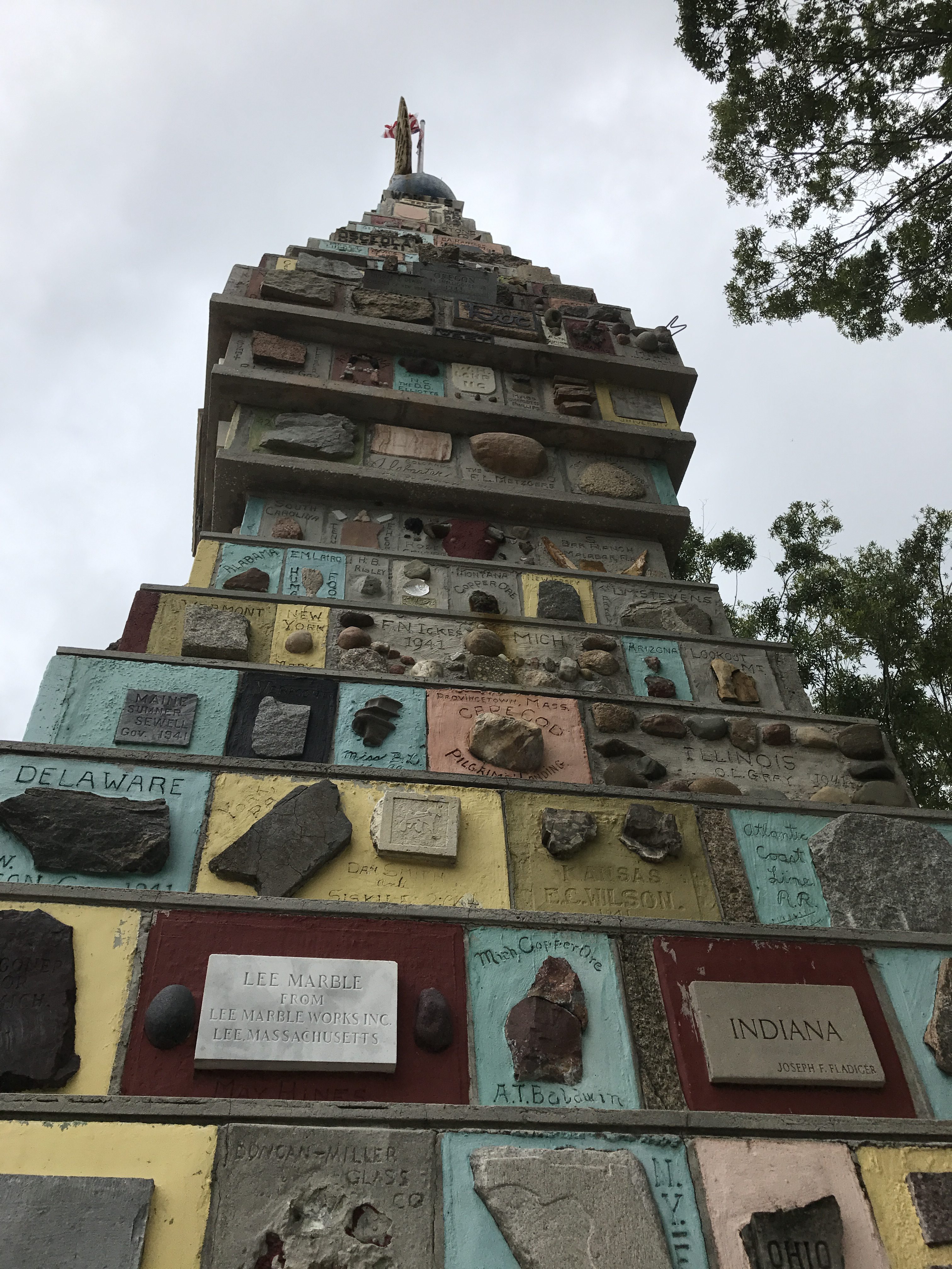 By 1943 the Doctor had a complete set from across the country. Reportedly he took the pile and had them put into blocks, inscribed with what each one was and mortared into a 50-foot obelisk of multi-colored concrete slabs.