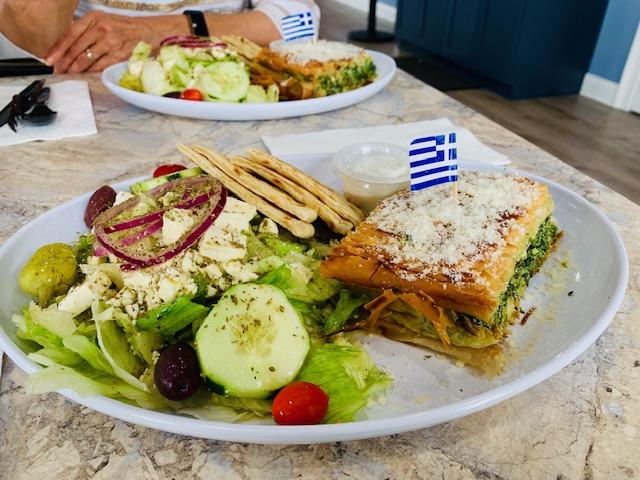 Our go-to is the Spanakopita Dinner. These giant pieces of spinach pie served with a Greek Salad and Pita Bread is enough for lunch and a to-go box as well.