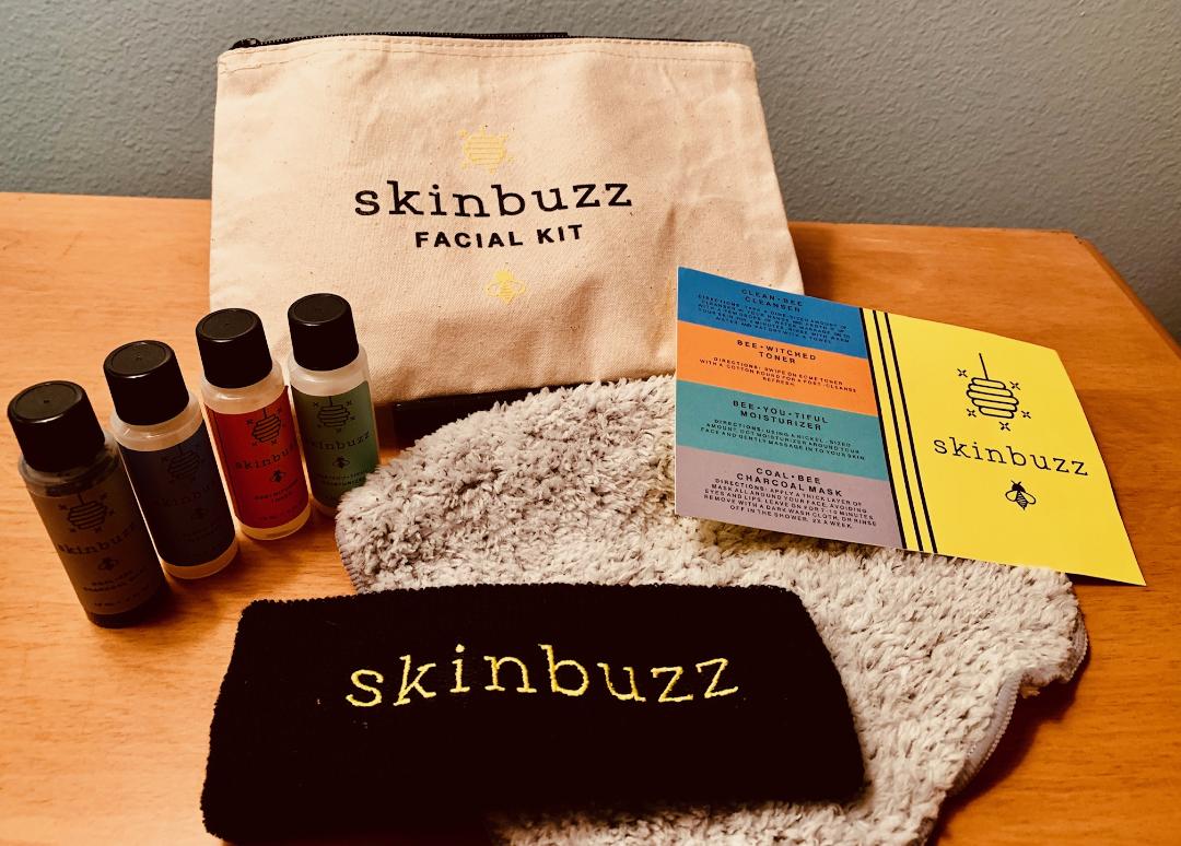 Recently we obtained a new product called Skinbuzz. It all came in a neat little travel bag. Inside is an activated charcoal and bamboo facecloth, a headband and vials of their product. That includes the Clean•Bee Cleanser, Bee•Witched Toner, Bee•You•Tiful Moisturizer and the Coal•Bee Clay Mask.
