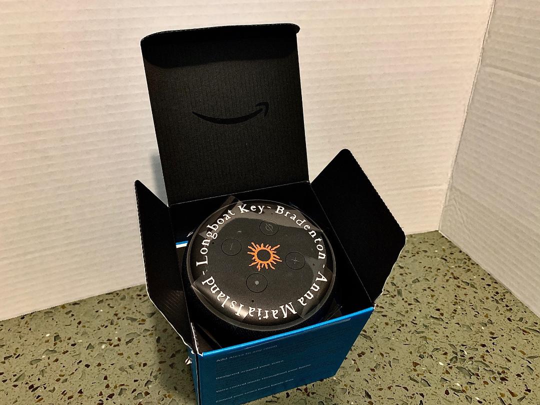 A few short days later the UPS man rang our doorbell and handed us the small brown box. Opening it up, we found not only an echo dot, but a personalized unit with “Bradenton-Anna Maria Island-Longboat Key” emblazoned around the top ring. Their trademark sun emblem in the middle.